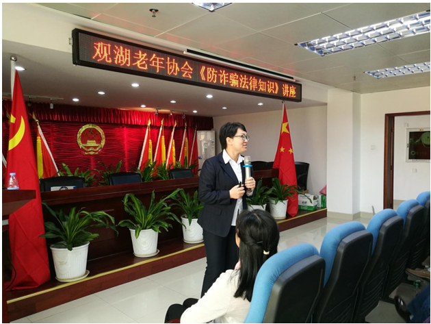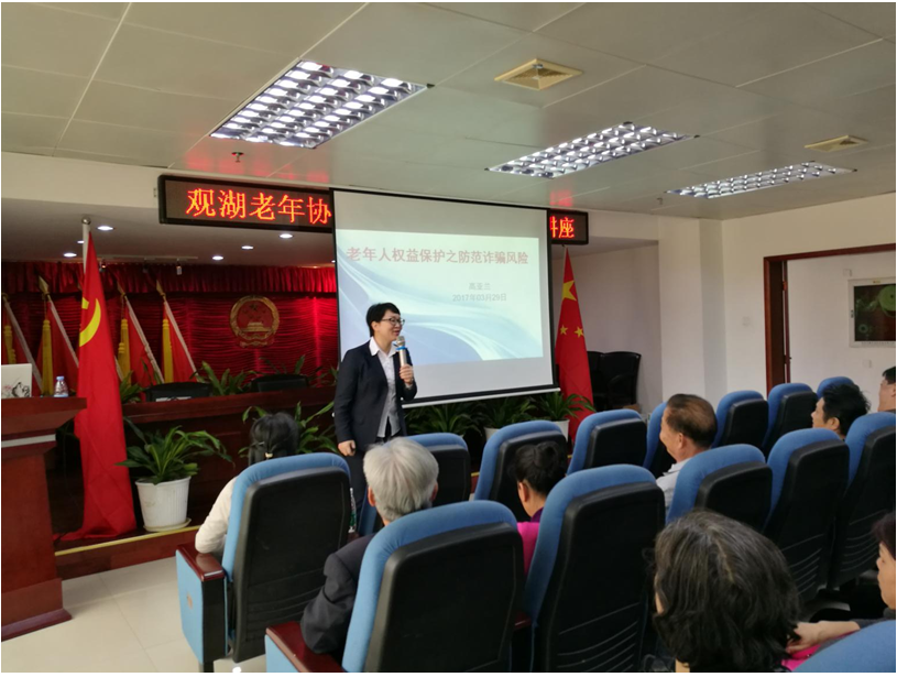 近年来,社会上频发老年人被诈骗事件,现行的各种诈骗手段也是花样百出,防不胜防。为更好地保护老年人权益,2016年3月27日,广东法迈律师事务所高亚兰律师在松元厦社区工作站,为观湖老年人协会的老年人朋友开展《老年人权益保护之防范诈骗风险》的专题讲座。
