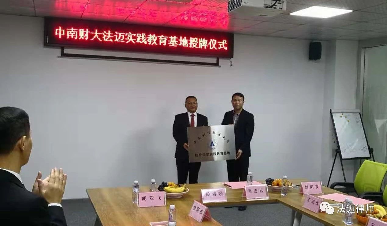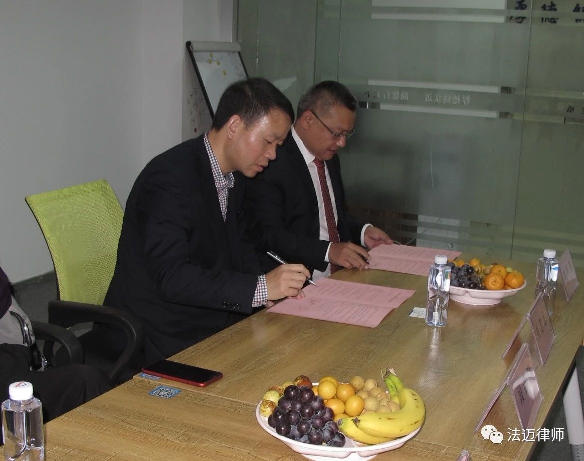 11月18日,中南财经政法大学校外法学实践教育基地签约及授牌仪式在广东法迈律师事务所二楼会议室举行。中南财经政法大学法学院副院长肖志远、广东法迈律师事务所主任刘斯亮律师代表双方在合作协议上签字,肖志远副院长为广东法迈律师事务所授牌。出席此次活动的还有深圳市龙华区律师工作委员会主任段春晓、中南财经政法大学法学院教学办主任胡亚飞、广东法迈律师事务所合伙人李鸿博、徐阿杰、王大应、邹拥军、鞠建宇,广东法迈律师事务所部分律师及实习律师代表。